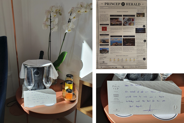 Das Hotel bietet ein exzellentes Frühstücksbüffet. Zum Geburtstag gab’s Extrasekt zum Frühstück und eine Flasche Sekt aufs Zimmer.